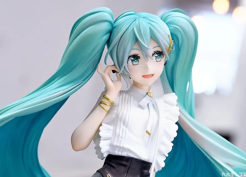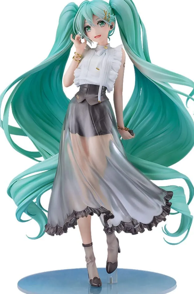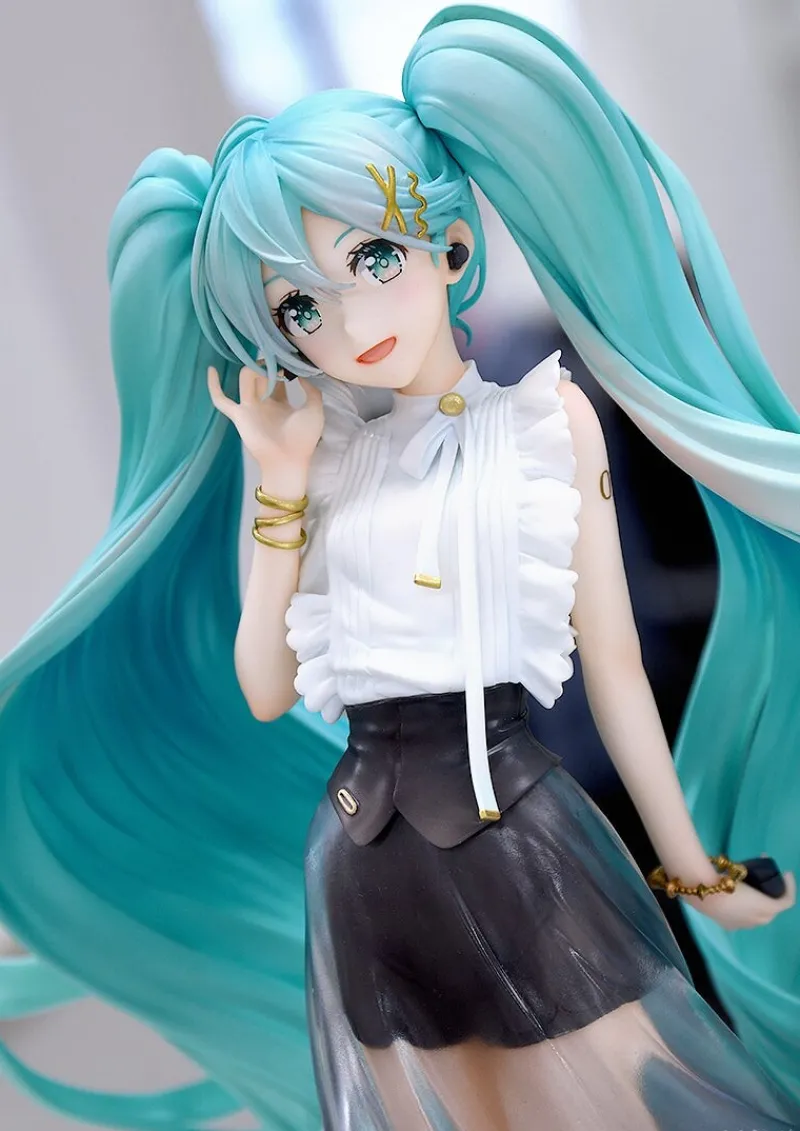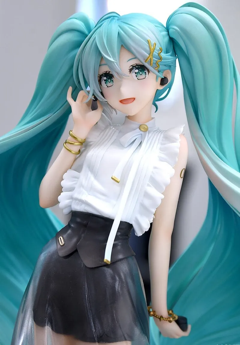 From Character Vocal Series 01: Hatsune Miku, comes a beautiful 1/6 scale figure of Hatsune Miku, NT Style Casual Wear Version. Based on an illustration by Rella, Miku has been faithfully recreated in stunning detail in this figure. Miku is dressed in a casual outfit of a white frilly blouse, a black mini skirt with a see through longer overskirt and black sheer boots. The whole outfit is toped off with a black cinching waist belt and golden accessories. This might be different from her usual look, but Miku is rocking street fashion looking cute and playful in her new outfit. He twin tails cascade down behind her super full and luscious, spiralling down to her ankles. This is a truly beautiful figure to add to your collection.