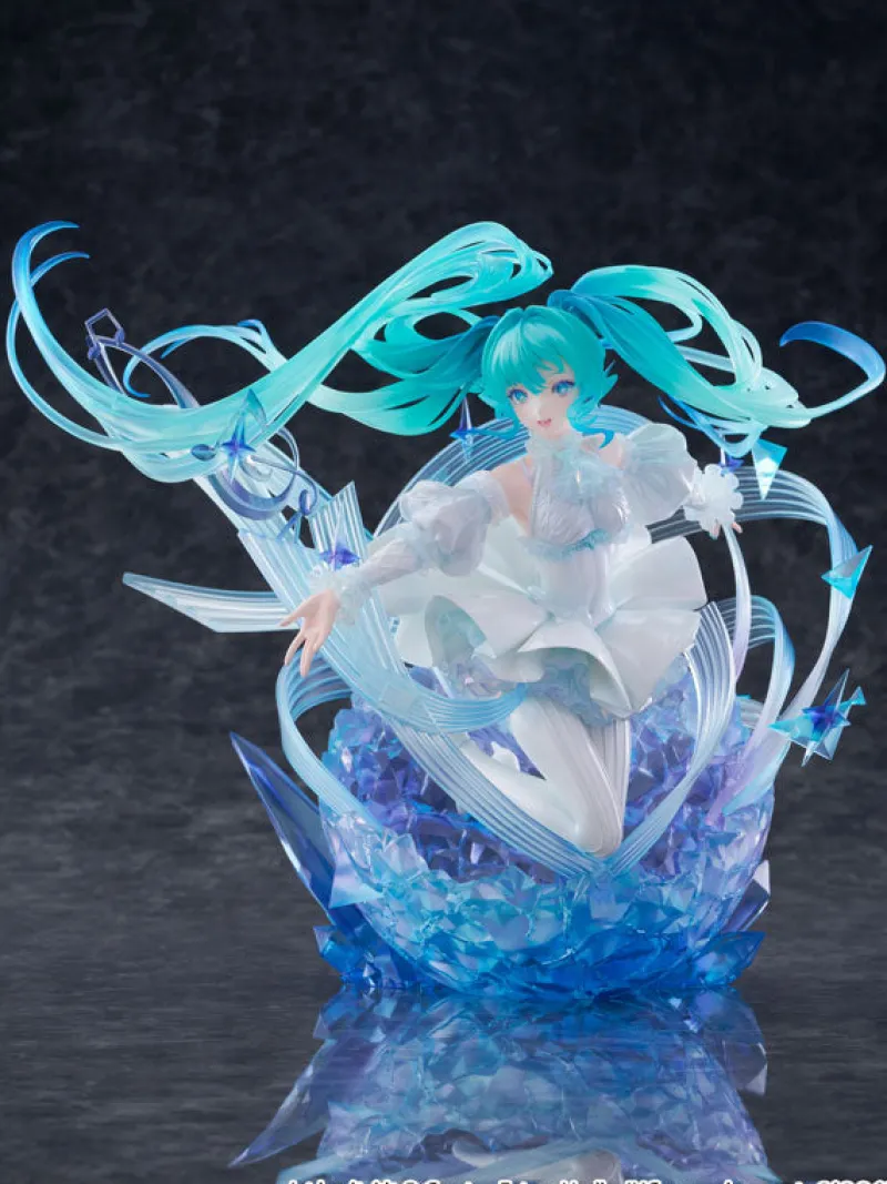 What if your favorite Vocaloid diva emerged from a shimmering crystal wonderland? Meet the stunning Hatsune Miku in her enchanting Crystal Dress Ver.! This figure captures the essence of magic and music with swirling, ethereal hair that sparkles like the night sky. Miku stands gracefully in a translucent gown that flows around her like a gentle breeze, supported by an intricate base adorned with sparkling gem-like pieces that glow with an otherworldly charm. The vibrant blues and soft whites create a dreamy visual spectacle that would make anyone swoon. Add this captivating masterpiece to your collection, and let Miku serenade your soul with her mesmerizing presence!