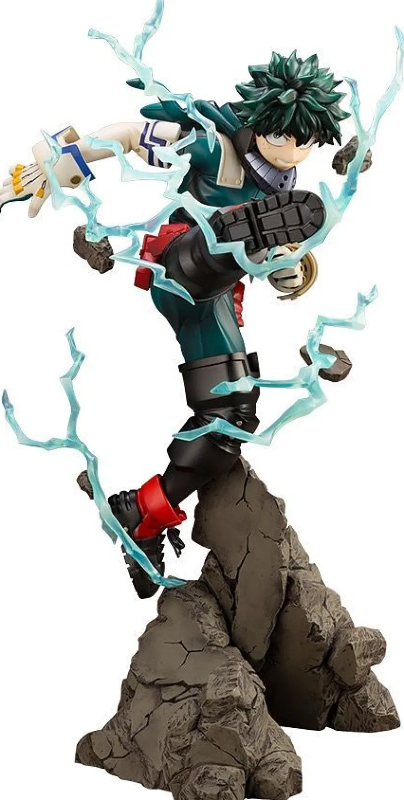 This dynamic figure of Midoriya Izuku, from Boku no Hero Academia, captures the hero-in-training at the height of action. Sculpted by Kotobukiya in 1/8 scale, Deku is depicted mid-air, launching a powerful kick with his signature “One For All” quirk visibly surging through his body as electric blue energy trails wrap around him. The meticulous attention to detail is evident in the fierce determination on his face and the tension in his pose, all while his costume, including his iconic green jumpsuit, black boots, and red belt, is recreated with precision. The rocky base adds an extra layer of intensity, making this figure a must-have for any fan of the series.
