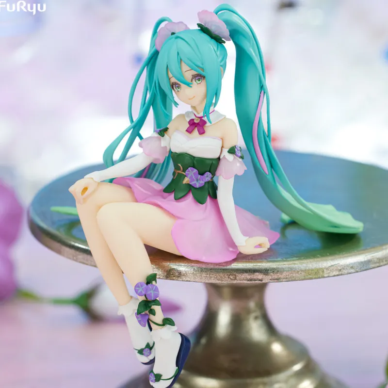 Capture the enchanting elegance of Hatsune Miku with this exquisite Flower Fairy Noodle Stopper Figure in her charming Asagao (Pink) version. Seated gracefully, Miku exudes a serene beauty, her teal twin-tails adorned with delicate purple flowers that match the lovely floral motifs on her outfit. Her attire features a soft pink dress accented with green and purple details, perfectly complemented by her dainty shoes with matching floral embellishments. The intricate sculpting and vibrant colors bring Miku to life, making this figure a stunning addition to any collection, capturing the essence of a magical fairy in every detail.