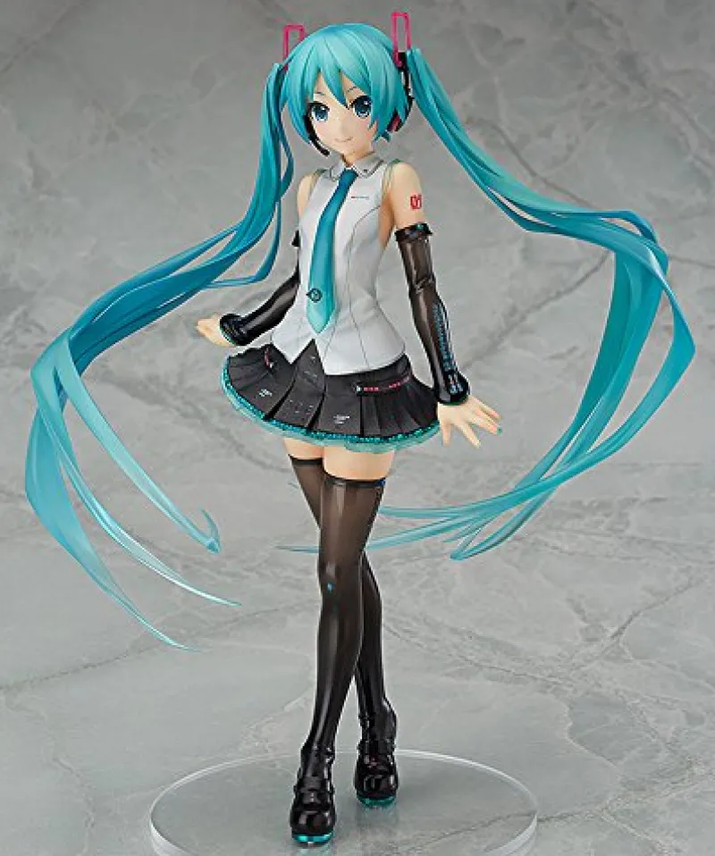 From Character Vocal Series 01: Hatsune Miku, comes a beautiful 1/8 scale figure of Hatsune Miku, V4X Version. Based on an illustration by iXmia and used as the main illustration for Hatsune Miku V4X, shows Miku’s new look in an elegant pose. Her outfit for this version was slightly modified to include a silver sleeveless shirt, black stockings, mini skirt and arm sleeves with her signature blue accenting the black as well as adorning her tie. This figure has Miku’s blue accents in a clear painted colour, allowing light to catch the figure in interesting ways. This can also be seen in her hair which gradients from solid blue to clear blue at the tips. With her cute pose and soft appearance this Miku will surely steal your heart!