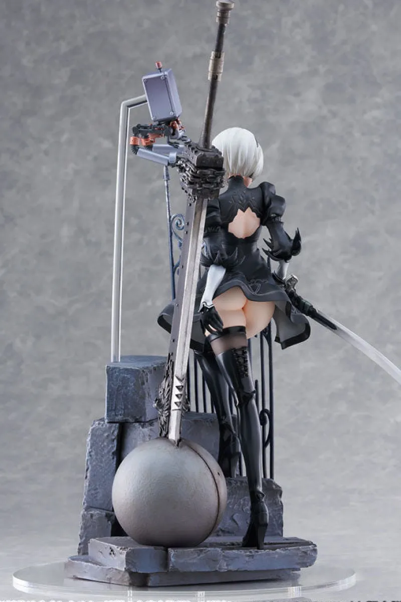 Introducing the breathtaking YoRHa No. 2 Type B (2B) -Exploration- 1/7 scale figure from “NieR: Automata Ver1.1a,” created by Proof. This stunning figure captures 2B in an iconic and dynamic pose, stepping up a stone staircase with her sword drawn and ready for action. Dressed in her signature black combat outfit, the meticulous detailing highlights the intricate design of her attire, including the delicate lace and flowing skirt. The scene is complemented by Pod 042, hovering beside her, adding a sense of authenticity and depth to the display. The beautifully crafted base, with wrought iron railings and stone steps, sets the perfect stage for 2B’s graceful yet powerful presence. This figure is a must-have for “NieR: Automata” fans, showcasing the elegance and strength of the beloved character in exquisite detail.