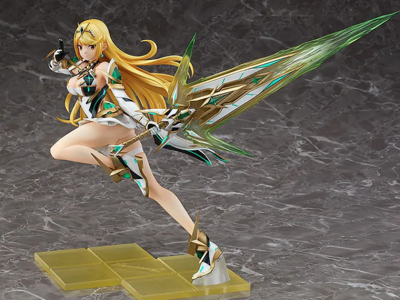This breathtaking figure of Mythra from Xenoblade Chronicles 2 captures the character’s fierce elegance and dynamic power. In mid-leap, Mythra is poised to strike, her golden hair flowing behind her, embodying the intensity of battle. Her intricate armor shines with metallic accents, beautifully contrasted by the translucent green energy emanating from her sword. The attention to detail in her outfit, from the gold-trimmed boots to the flowing white skirt, highlights her divine aura. With a confident expression and perfectly balanced pose, this figure is a stunning representation of Mythra’s strength and grace, making it a must-have for any Xenoblade Chronicles fan.