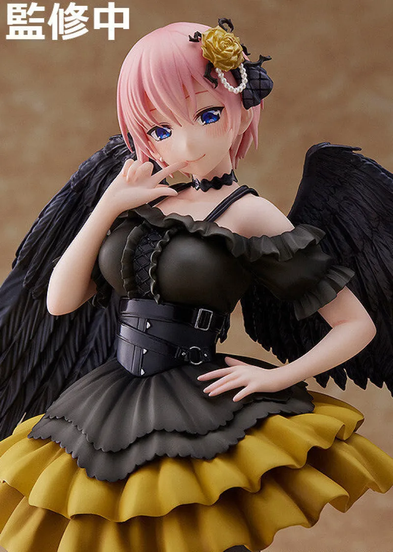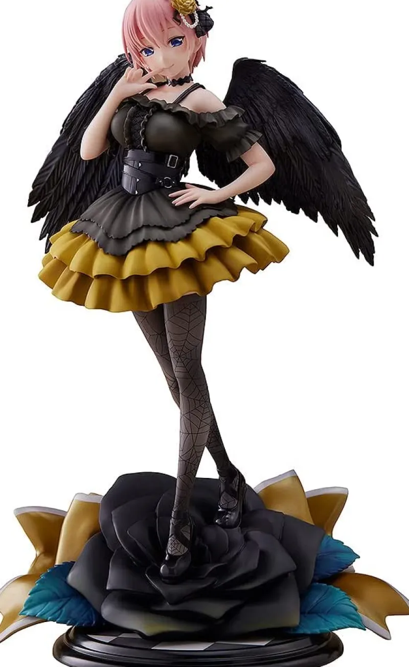 Embrace the captivating elegance of Ichika Nakano from “Gotoubun no Hanayome” with this stunning 1/7 scale Fallen Angel version figure by Alice Glint, Good Smile Company, and Proof. Ichika is portrayed in a gothic-inspired outfit, featuring a black and yellow layered dress that accentuates her graceful silhouette. Her delicate pink hair and expressive blue eyes are meticulously sculpted, capturing her charming allure. The figure’s intricate details, from the lacy black choker and patterned stockings to the feathered black wings, add depth to her fallen angel theme. Ichika stands gracefully atop a beautifully crafted black rose base, enhancing the figure’s dramatic and enchanting aesthetic. This exquisite figure is a must-have for fans of “Gotoubun no Hanayome,” showcasing Ichika’s refined beauty and captivating presence.