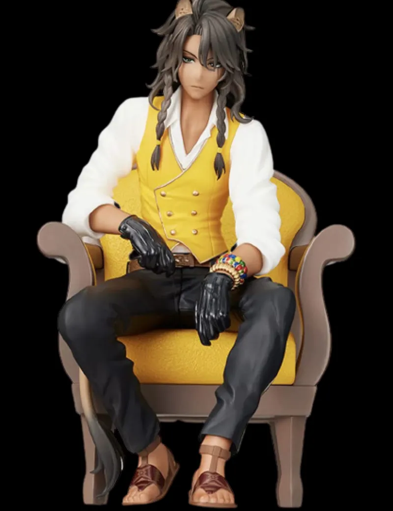 Introducing the regal Premium Grace Situation Figure of Leona Kingscholar from Twisted Wonderland by SEGA. This figure perfectly captures Leona’s commanding presence and relaxed confidence as he sits elegantly on a throne-like chair. Dressed in a stylish outfit featuring a yellow vest over a white shirt and black pants, Leona’s look is completed with black gloves and an array of colorful bracelets. His long, dark hair, styled in braids, and feline ears add to his distinctive appearance. The intricate details, from the folds in his clothing to the textures of his accessories, showcase exceptional craftsmanship. This figure is a must-have for any Twisted Wonderland fan, bringing Leona’s charismatic and royal demeanor to life in stunning detail.