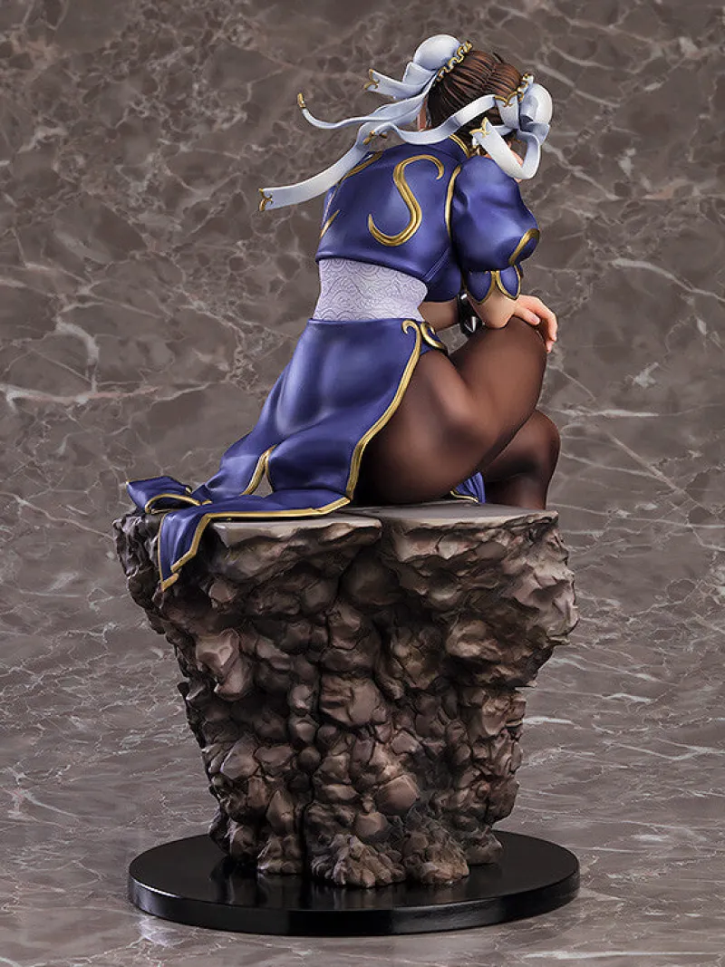 Celebrate the iconic allure of Chun-Li from “Street Fighter” with this stunning 1/6 scale figure by Max Factory. This exclusive figure captures Chun-Li in a relaxed, yet powerful pose, seated gracefully on a rugged stone block. Her classic blue qipao, adorned with gold trim, highlights her elegance and strength, while her muscular legs encased in black stockings emphasize her status as the strongest woman in the world. The meticulous details, from her spiked bracelets to the flowing ribbons in her hair, showcase the craftsmanship of this piece. Chun-Li’s confident expression and poised demeanor make this figure a must-have for fans, bringing the fierce and graceful warrior to life in your collection.