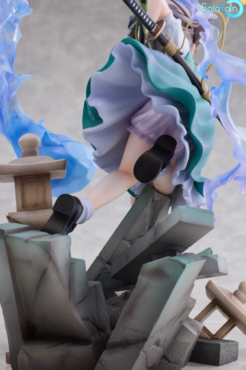 Step into the enchanting world of Touhou Project with the stunning figure of Konpaku Youmu, capturing her in a breathtaking Half-Human Half-Phantom Gardener version! This 1/7 scale stunner depicts Youmu wielding her sword with mastery, elegantly poised against a backdrop of swirling blue flames that radiate an ethereal vibe. Her striking gray hair cascades around her, framing her fierce yet serene expression, accompanied by delicate details like her black bow. Crafted with incredible attention to detail, her outfit features intricate textures and a vibrant color palette that truly brings her character to life. The dynamic pose and the mystical aura surrounding her make this figure an eye-catching centerpiece for any collection. Embrace the spirit of the supernatural with this mesmerizing depiction of Youmu, where every glance invites you into her magical realm!