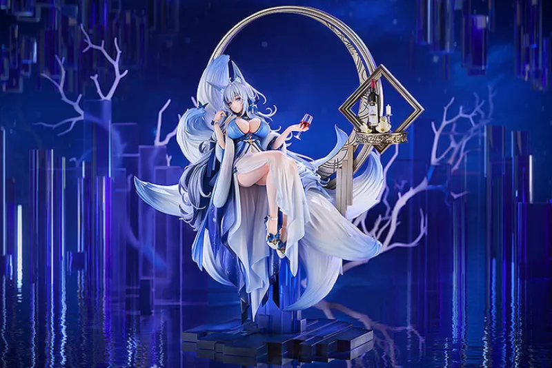 Immerse yourself in the enchanting allure of Shinano from “Azur Lane” with this stunning 1/7 scale Dreams of the Hazy Moon Ver. figure by Good Smile Arts Shanghai and Good Smile Company. Shinano is elegantly posed, lounging with a glass of wine in her delicate hand, exuding sophistication and grace. Her intricate outfit, a blend of celestial blues and whites adorned with delicate snowflakes, flows beautifully around her, highlighting her ethereal beauty. The figure features her iconic fox ears and multiple tails, adding a touch of mystique. The luxurious base, complete with a circular frame and a detailed wine shelf, enhances the overall aesthetic, creating a scene of opulence and tranquility. This figure is a breathtaking centerpiece for any “Azur Lane” collection, capturing Shinano’s serene and captivating presence.