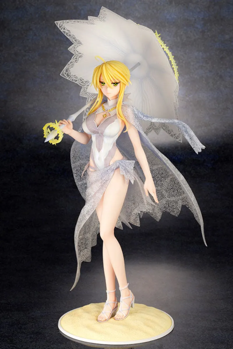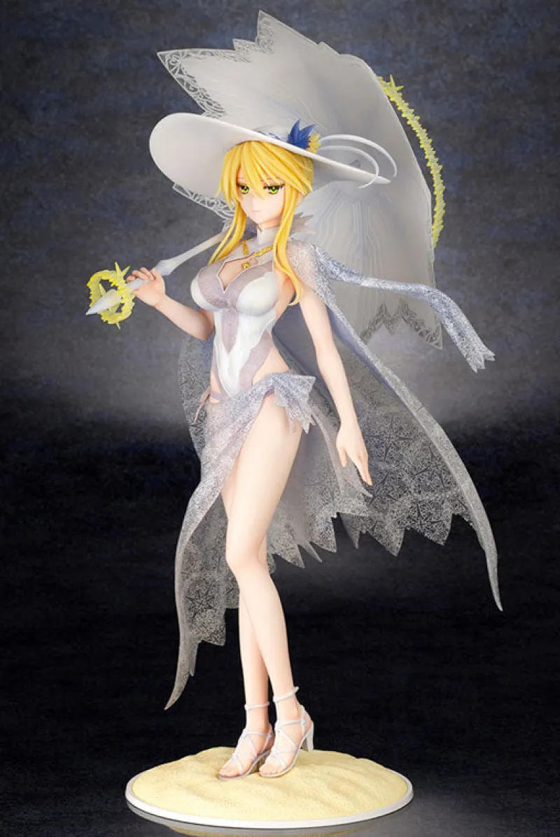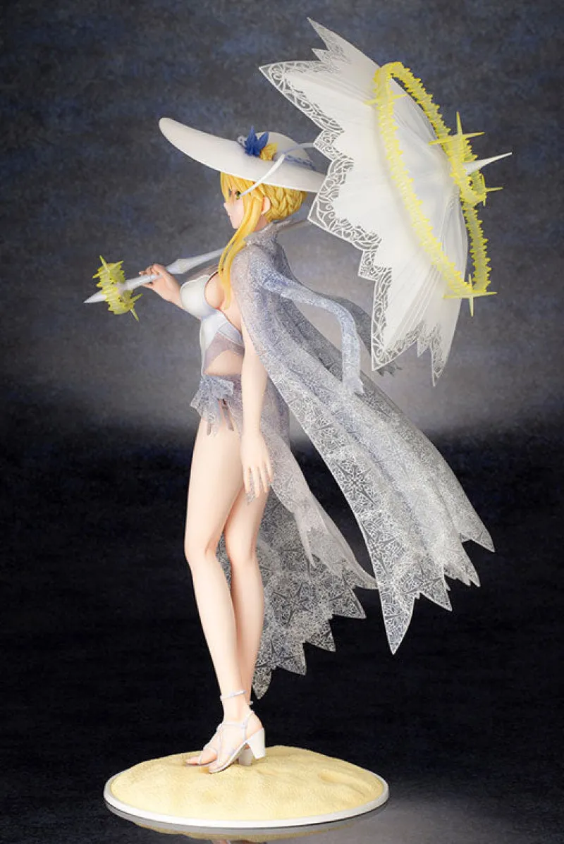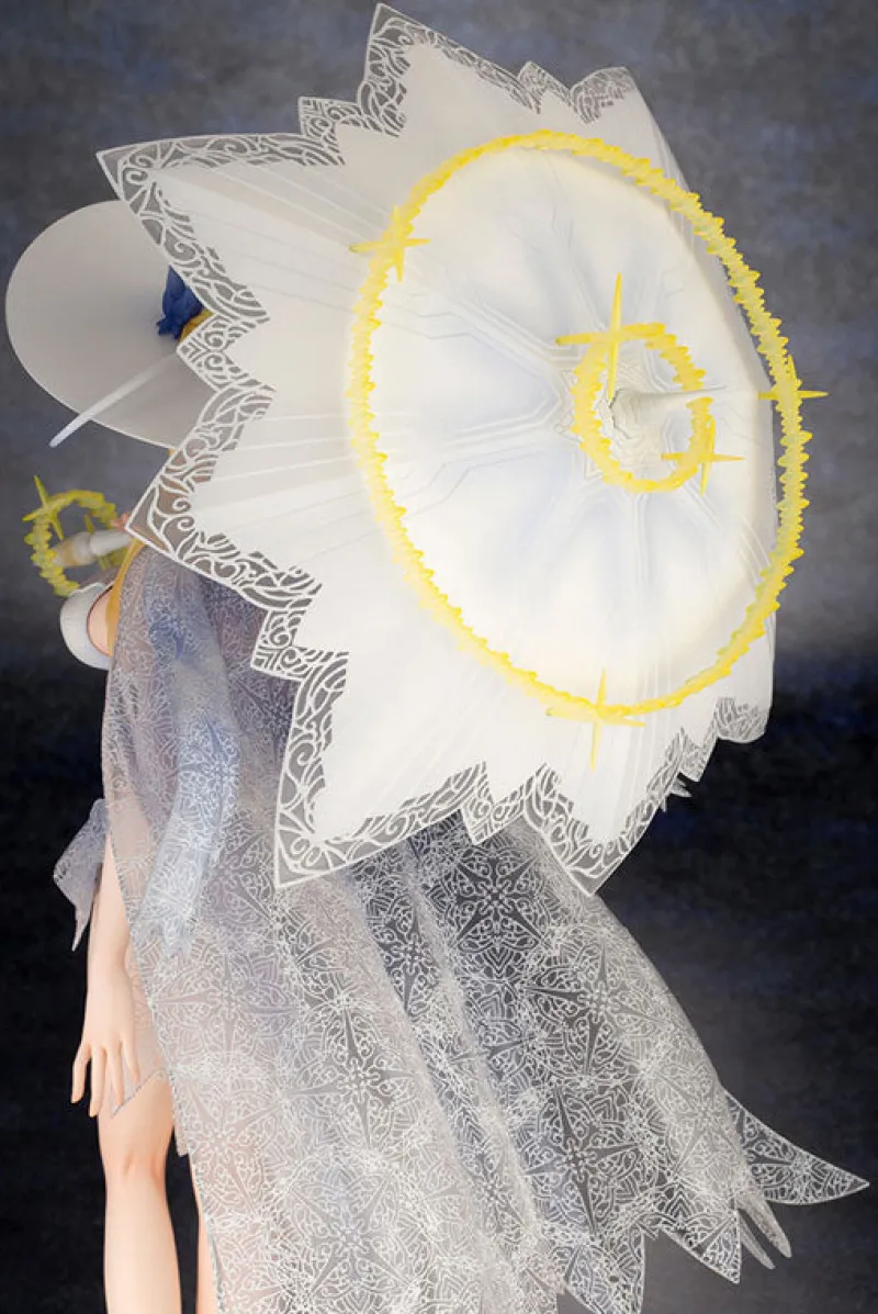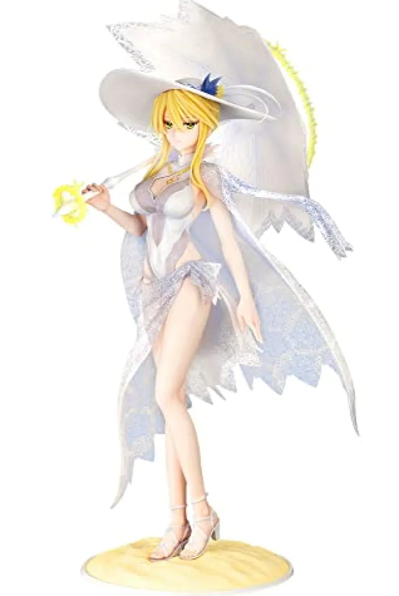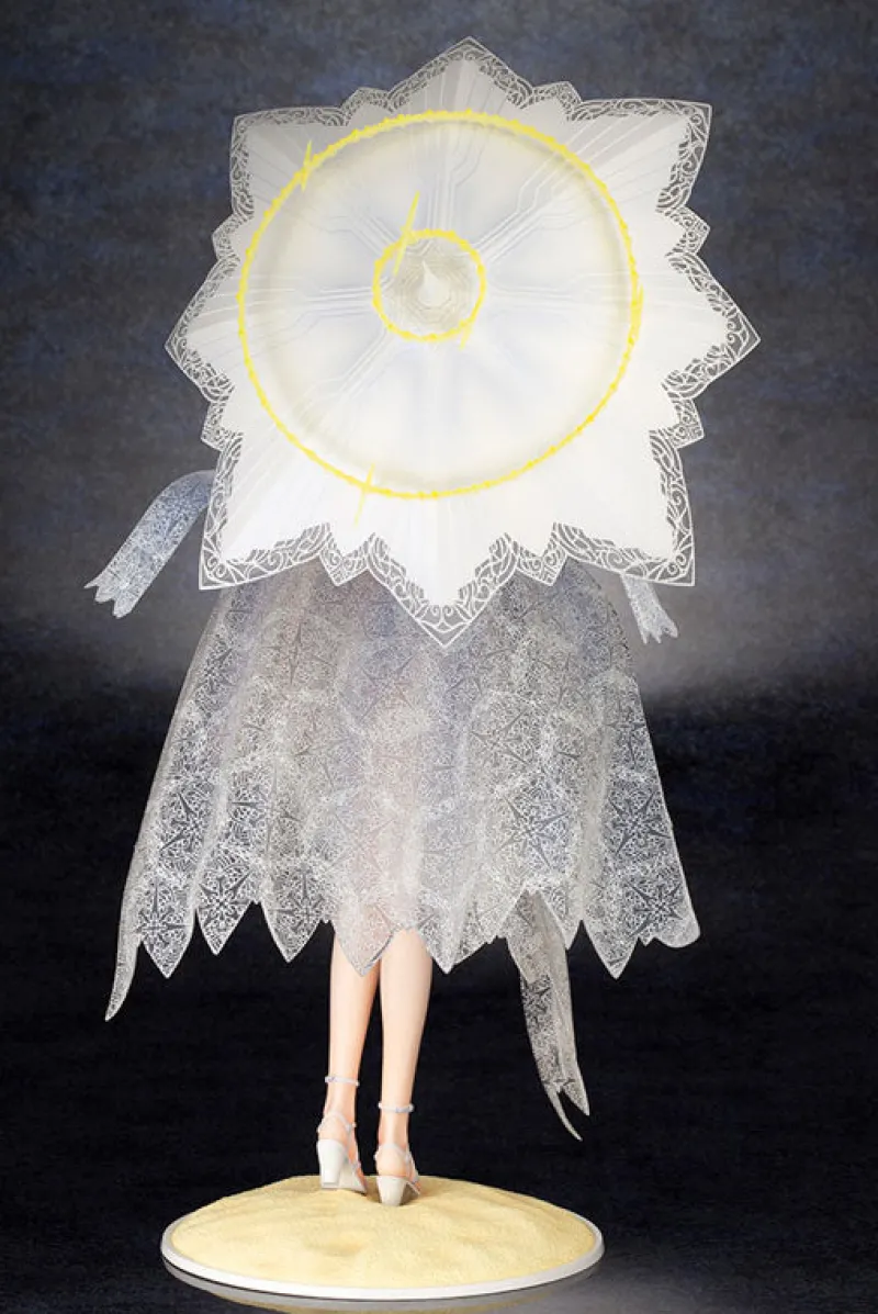 Elegance and majesty come together in this stunning 1/7 scale figure of Altria Pendragon from “Fate/Grand Order,” brought to life by Kotobukiya. Depicting Altria in her serene Ruler form, this figure showcases her in a delicate, sheer white dress adorned with intricate lace details. She holds a parasol that complements her ethereal look, with her golden hair cascading gracefully beneath her wide-brimmed hat. Her calm and regal expression, combined with the flowing cape that mimics the delicate wings of an angel, adds to her divine presence. Set on a sandy base, this figure captures the essence of Altria’s tranquil yet powerful aura, making it a captivating addition to any collection.