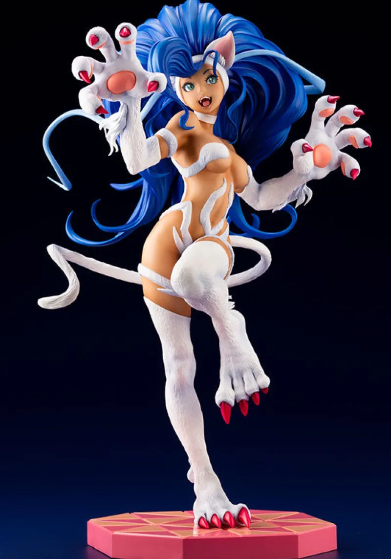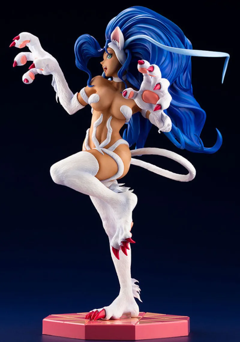 Unleash the wild and playful spirit of Felicia from Vampire with this captivating 1/7 scale Bishoujo Statue by Kotobukiya. Felicia’s dynamic pose, with her arms raised and legs ready to pounce, captures her feline agility and exuberance. Her striking blue hair flows wildly around her, accentuating her lively energy. The intricate detailing on her feline features, from her sharp claws to her fluffy ears and tail, showcases exceptional craftsmanship. Her expressive face, complete with bright eyes and a joyful smile, embodies her spirited personality. Set on a vibrant red base, this figure perfectly balances charm and ferocity, making it an essential addition for fans of the Vampire series and collectors of dynamic character statues.