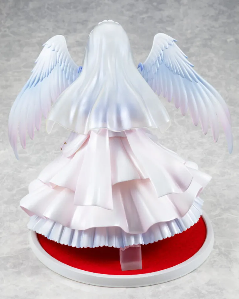 Embrace the ethereal beauty of Tenshi from Angel Beats! with this stunning 1/7 scale KDcolle Wedding Ver. figure by Kadokawa. This enchanting figure depicts Tenshi in a delicate wedding dress, exuding purity and grace. The dress is intricately detailed with flowing layers and elegant bows, capturing a sense of motion. Her serene expression and soft, cascading hair enhance her angelic appearance, while the beautifully sculpted wings add a touch of heavenly charm. Tenshi holds a bouquet of white and yellow flowers, complementing her pristine ensemble. The figure stands on a red, round base that contrasts beautifully with her white dress, making this piece a captivating centerpiece. Perfect for fans of Angel Beats!, this figure embodies the serene and angelic essence of Tenshi in a heartwarming, bridal moment.