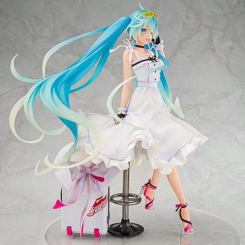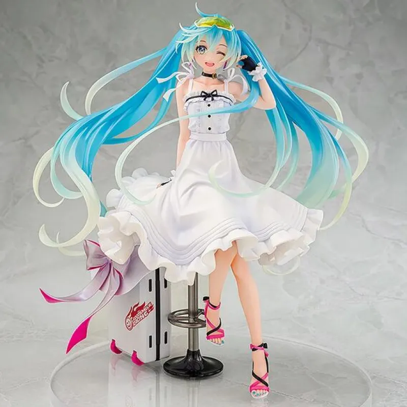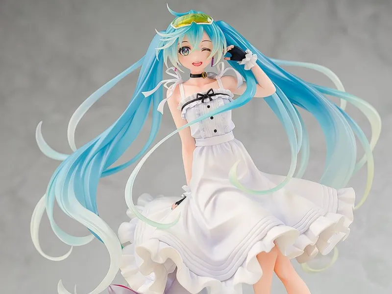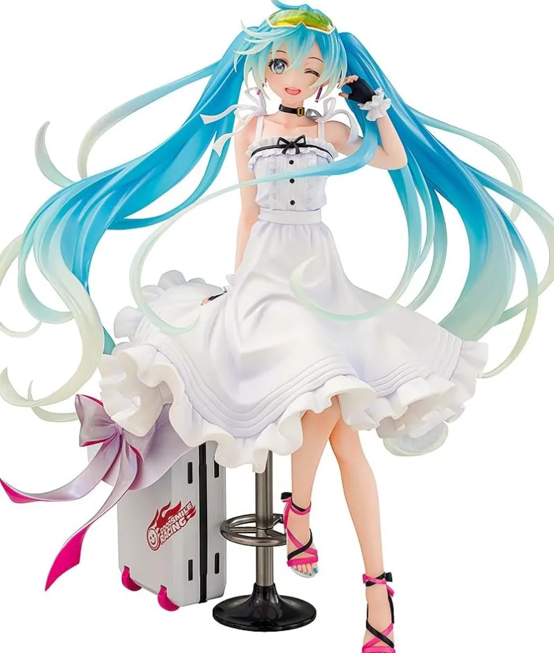 Capture the essence of summer with the Hatsune Miku 2021 Vacation Style Ver. 1/7 scale figure by Wonderful Works and Good Smile Racing. Miku is portrayed in a breezy white sundress, complete with delicate frills and bow accents that evoke a sense of carefree elegance. Her turquoise twin tails flow beautifully, adding a dynamic touch to the figure’s design. She winks playfully, embodying a joyful, relaxed vacation vibe. Beside her is a stylish racing-themed suitcase adorned with a pink ribbon, hinting at her racing spirit. With colorful sandals and bright glasses on her head, this figure perfectly encapsulates Miku’s vibrant and cheerful personality, making it a delightful addition to any collection.