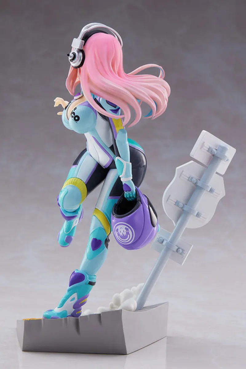 Bring home the dynamic energy of Super Sonico with this vibrant Tenitol figure by FuRyu. Capturing Sonico in a lively running pose, this figure showcases her in a futuristic, form-fitting outfit in shades of teal, purple, and black. Her pink hair flows behind her, adding a sense of motion and excitement. The figure is full of playful details, including her signature headphones and the unique base adorned with road signs and a burst of dust as she speeds off. This figure perfectly encapsulates Sonico’s cheerful and energetic spirit, making it a must-have for fans and collectors alike.