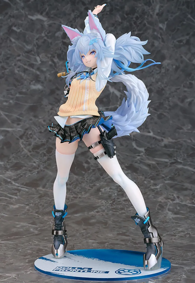 Capture the lively spirit of PA-15 from Girls’ Frontline in this exquisite 1/7 scale figure by Phat Company. The figure showcases PA-15 in a dynamic pose, bursting with energy and style. Her playful expression is beautifully contrasted by her fluffy, sky-blue fox ears and tail, adding a touch of whimsy to her otherwise fierce demeanor. The intricately sculpted outfit combines a cozy sweater layered over a crisp school uniform with a checkered skirt, exuding a blend of cuteness and cool. Her high-tech boots and the intricate details of her gun strapped to her thigh bring out the battle-ready aspect of this beloved character. Perfect for any Girls’ Frontline fan, this figure encapsulates PA-15’s unique blend of charm and power.