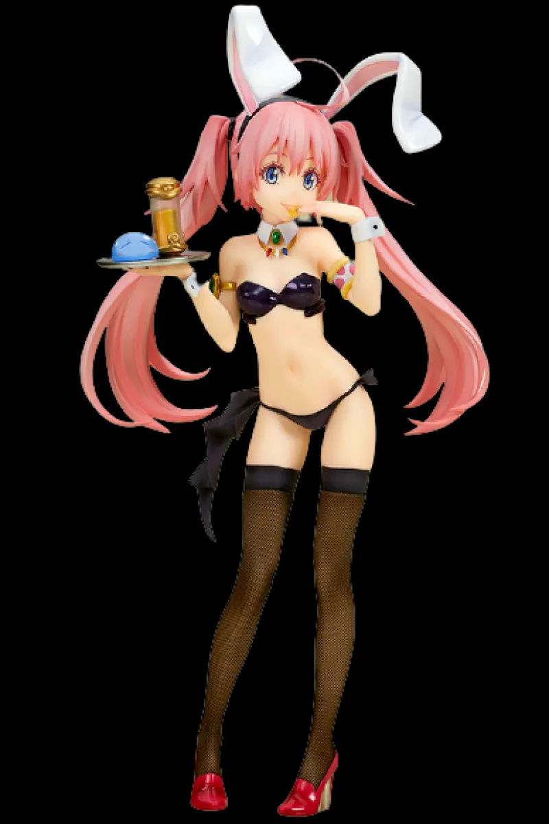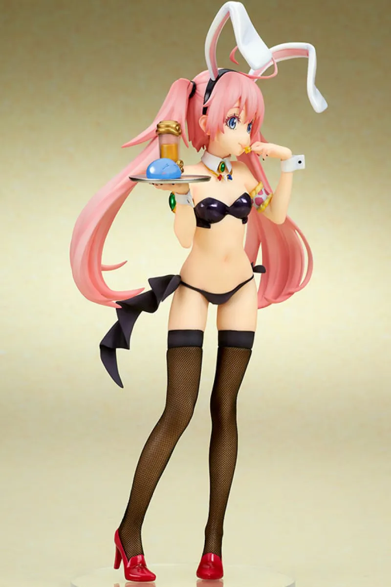 Step into the whimsical world of “That Time I Got Reincarnated as a Slime” with this captivating 1/7 scale figure of Milim Nava in her Bunny Girl style by Ques Q. Milim’s playful and energetic personality is brought to life with her adorable bunny outfit, complete with long white ears and a chic black bikini. Her vibrant pink hair, styled in twin tails, adds a splash of color and movement to the figure. Milim’s mischievous expression and confident pose, serving drinks on a tray, perfectly capture her charm. The intricate stockings and red heels add a touch of elegance, making this figure a delightful addition to any collection, showcasing Milim’s unique blend of cuteness and boldness.